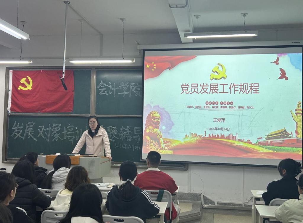 为严格遵循党员发展工作要求,助力发展对象全面熟悉入党流程、规范材料筹备工作,10月24日晚,会计学院2025 - 2026学年第一学期发展对象专题辅导活动在志道楼101教室顺利开展。此次专题辅导特别邀请党委组织部组织科科长王爱萍,为学院全体发展对象作“党员发展工作规程”专题辅导讲座,全体发展对象均参与了本次培训。