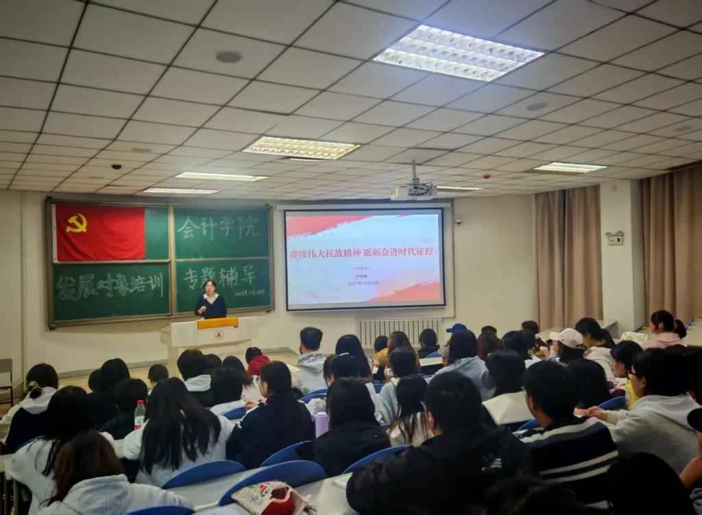 为引导发展对象深刻领悟伟大抗战精神,筑牢理想信念根基,10月28日晚,会计学院2025-2026学年第一期发展对象专题辅导于知行楼106教室举行,本次专题辅导特邀芦海燕副院长为学院全体发展对象开展“赓续伟大抗战精神,砥砺奋进时代精神”专题辅导讲座,全体发展对象参与。