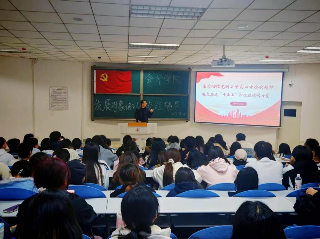 整场辅导会气氛严肃而热烈,同学们全神贯注,认真听讲记录。大家一致认为,通过此次学习,对全会精神的理解更加系统深入,理想信念更为坚定,前进方向更加明确,并且表示,将以全会精神为指引,积极向党组织靠拢,锤炼党性,增强本领。本次专题辅导的成功举办,有效提升了会计学院发展对象队伍的理论素养和政治站位,为学院党员发展工作的提质增效奠定了坚实的思想基础,也营造了学习宣传贯彻党的二十届四中全会精神的浓厚氛围。