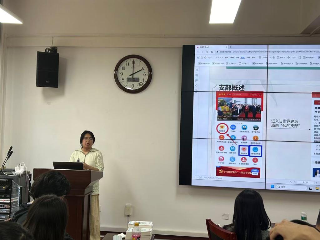在专项培训环节,四位党务助理结合工作实际,通过“政策解读+案例分析+实操演示”形式展开系统讲解。郭荣详细梳理了入党申请书、思想汇报、政审材料等档案的归档标准,强调细节管理的重要性。唐钰围绕甘肃党建平台功能模块,从会议上传、活动记录到数据审核,系统阐释全流程实操规范与注意事项。明楚航围绕全国党员信息系统功能模块,从账户管理到数据更新逐项演示操作流程,同步详解党员关系转入转出的跨系统对接要点与常见问题处理方案。李亚明对党内统计系统展开了详细讲解,内容涵盖党员信息录入流程,并着重剖析了在此过程中容易出现差错的各类问题。
